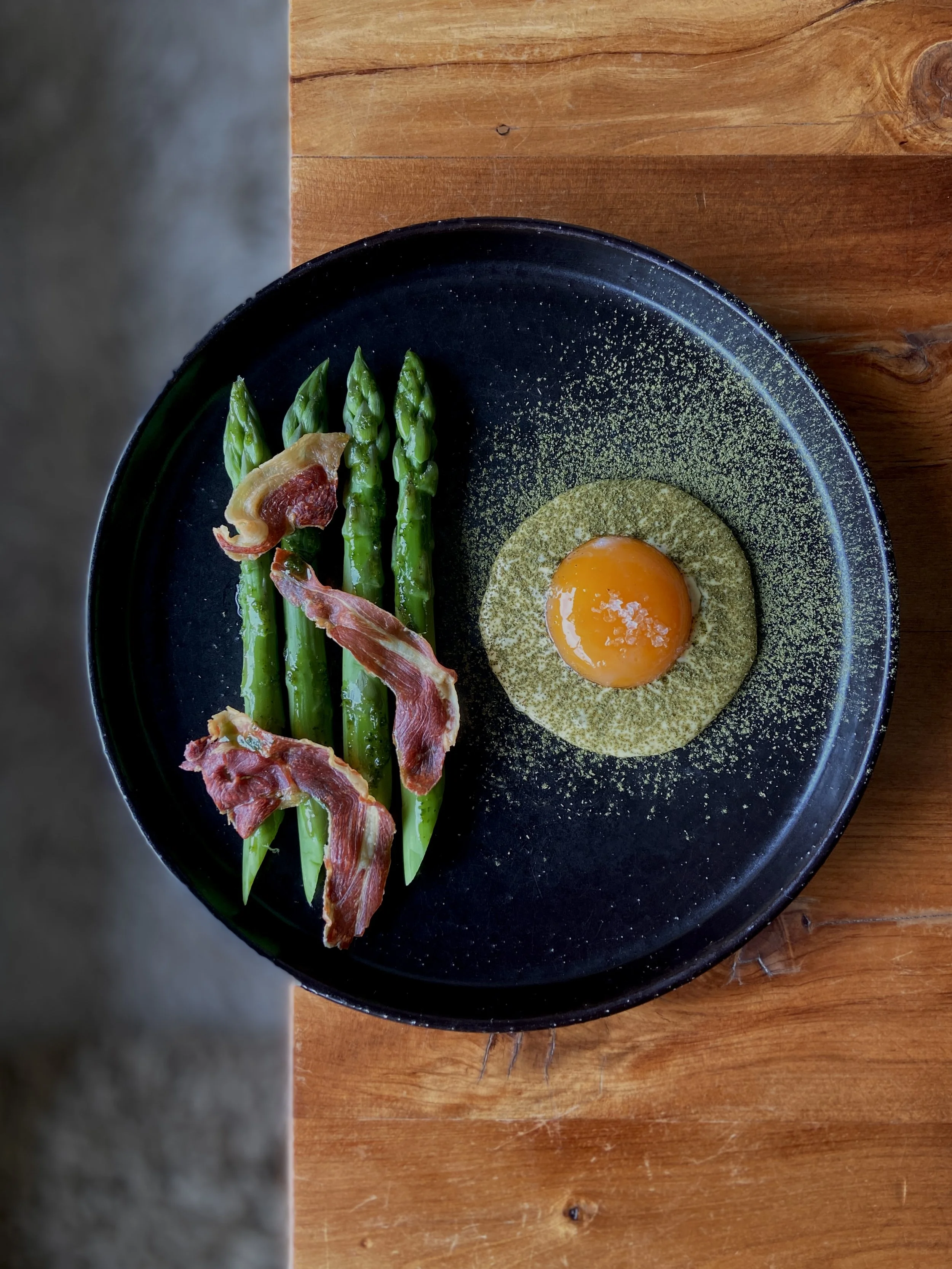 asparagus, bernaise, confit egg, crispy ham