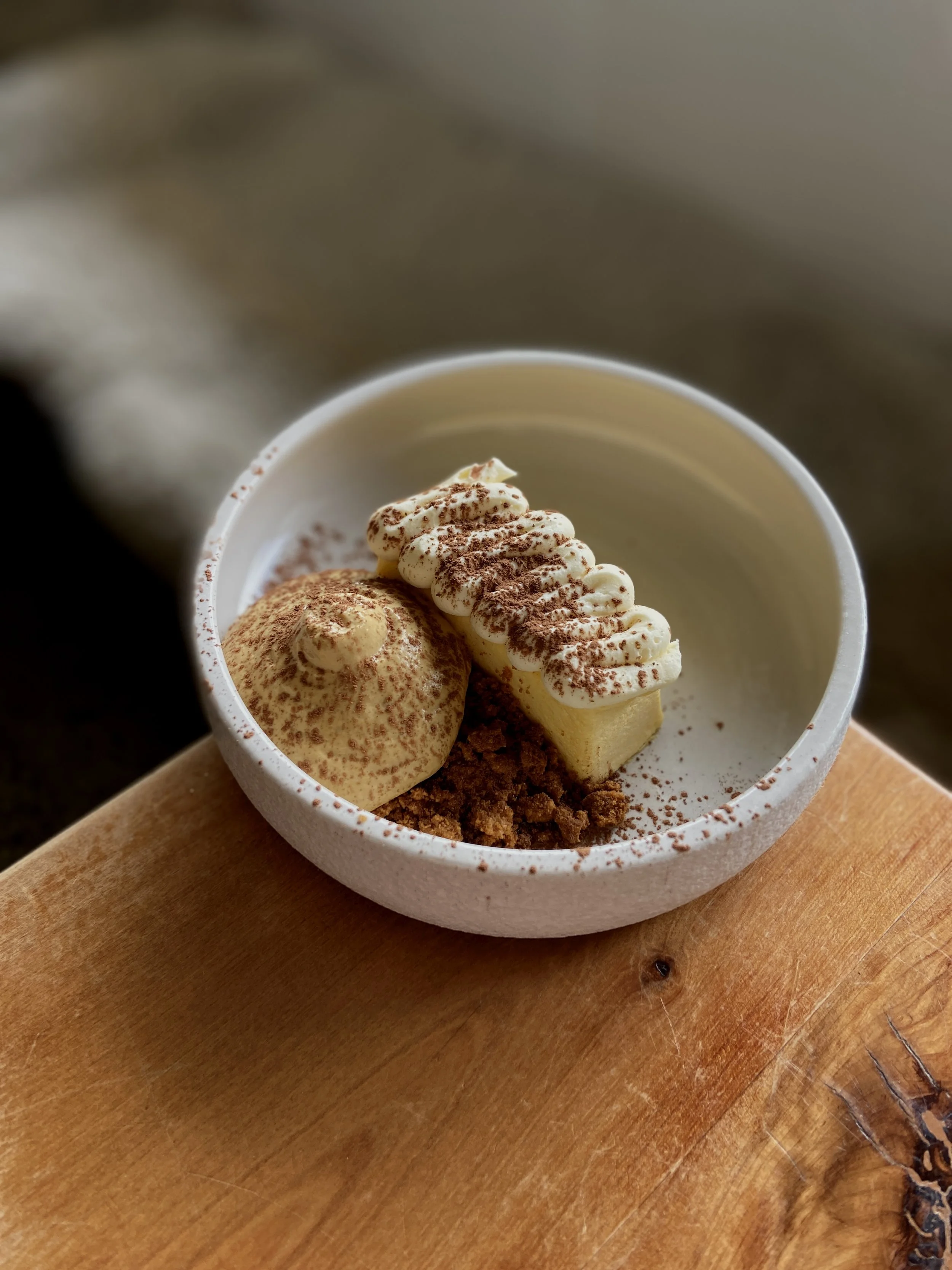 Another revisit for the menu. Last time we served up our tiramisu, we offered it as a sharing portion. Sure, sharing is fun but this time around we have restyled it to make it individual portions, because some things are best kept to ourselves. This is such a classic dessert that there’s no need to get too creative with the flavours, although we have taken a little artistic licence when it comes to the textures and assembly. Featuring a honey and almond semifreddo, whipped mascarpone, and coffee espuma. Check out our Instagram to watch it all come together.